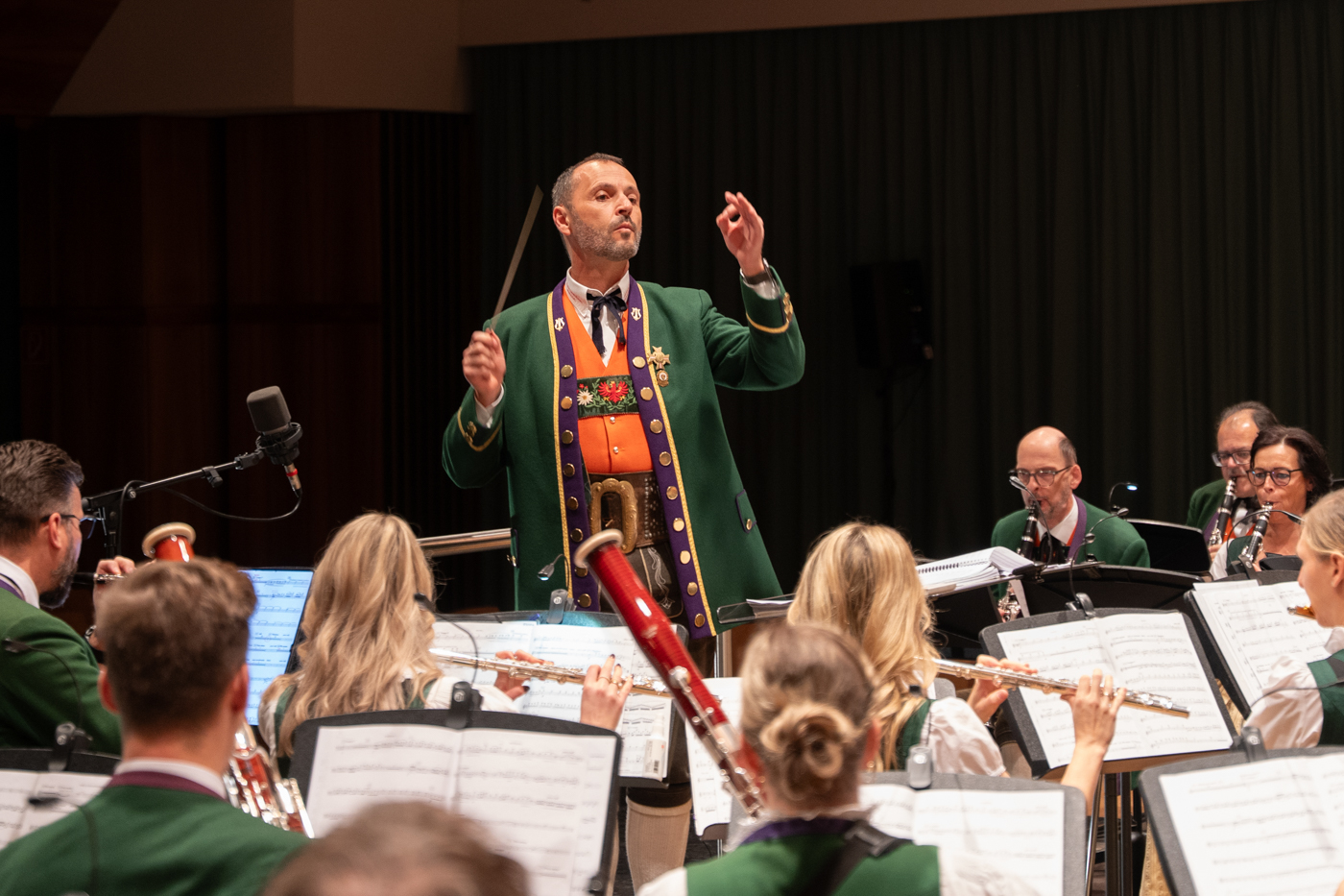 MUSIC PROJECT 2025. Im ersten Teil des Konzerts gab es einige Highlights aus früheren Konzerten. Schmid eröffnete mit „Conzensus“ von Jan Van der Roost. Conzensus – zusammenarbeiten, zusammen musizieren – ist seit 25 Jahren der prägende Geist in der MK Landeck, ist der Kapellmeister überzeugt, und das zeigt sich in der wunderbaren Musik. Es folgte ein Stück aus „Herr der Ringe“ – Gandalf the Wizzard – von Johan de Meij, sinfonische Blasmusik der Extraklasse. „Il Giudizio Universale“ – das Jüngste Gericht – folgte als Nächstes. Man schloss die Augen, hörte die Posaunen und wähnte sich am Himmelstor oder auch schon einen Schritt weiter – himmlisch schöne Musik eben. Beim letzten Stück vor dem großen Finale luden die Musiker zu einer Reise durch die schroffen, zum Teil abweisenden, aber auch wunderschönen Landschaften der schottischen Highlands ein. Beim Stück „Lord Tullamore“ roch man förmlich die Moore Schottlands und manch einer, wie der Kapellmeister, mag an ein berühmtes schottisches Getränk gedacht haben.